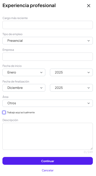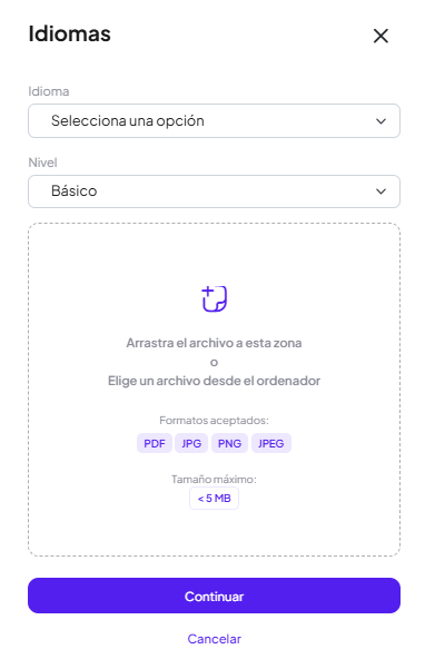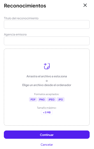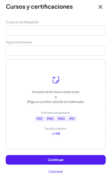 Para las secciones idiomas, reconocimientos, cursos y certificaciones, puedes complementar la información cargando archivos en formato PDF, DOCX, ODT, PAGES, PNG, JPEG o JPG con un peso menor a 5 MB por archivo.