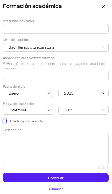 Agrega todos tus estudios: los que ya terminaste, los que dejaste y los que estás haciendo ahora. Añadir tus estudios muestra tu preparación y compromiso con el aprendizaje.