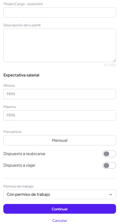 - Expectativa salarial: comparte los montos a los que esperas ganar en esta búsqueda de empleo.