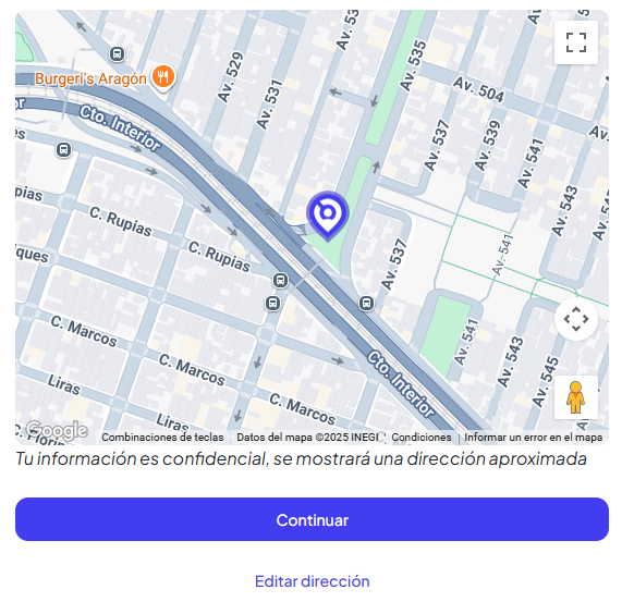 6. Una vez que el sistema encuentre tu dirección, verás un marcador en el mapa. Si no está en la posición correcta, puedes arrastrarlo hasta donde quieras. Nuevamente, da clic en "Continuar".