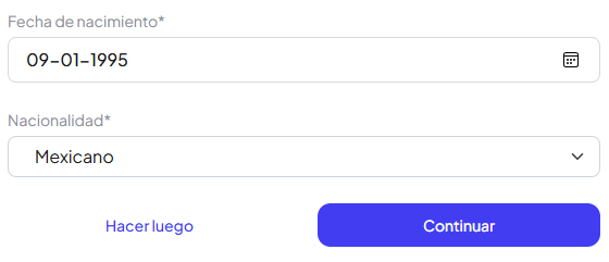 7. ¡Empecemos a conocer un poco sobre ti! Necesitamos saber dos cosas básicas: tu fecha de nacimiento y tu nacionalidad.